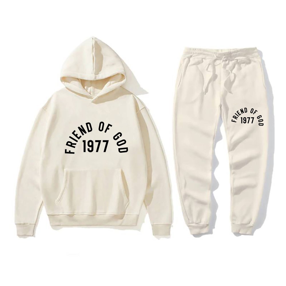 Made from a soft cotton-poly blend fabric that ensures all-day comfort, this tracksuit features a relaxed, unisex fit ideal for everyday wear or elevated casual style. The neutral Off White colorway pairs effortlessly with your favorite sneakers and accessories, making it a closet staple for streetwear enthusiasts. Check out the latest collection of essentials hoodie. Discover the Essentials Friend of God 1977 Tracksuit – Off White, a premium streetwear set that blends modern comfort with iconic 1977 heritage design. The raised “1977” logo delivers a timeless identity that connects fashion and cultural influence. Whether you wear it as a complete set or separate pieces, this tracksuit delivers comfort, quality, and effortless style.